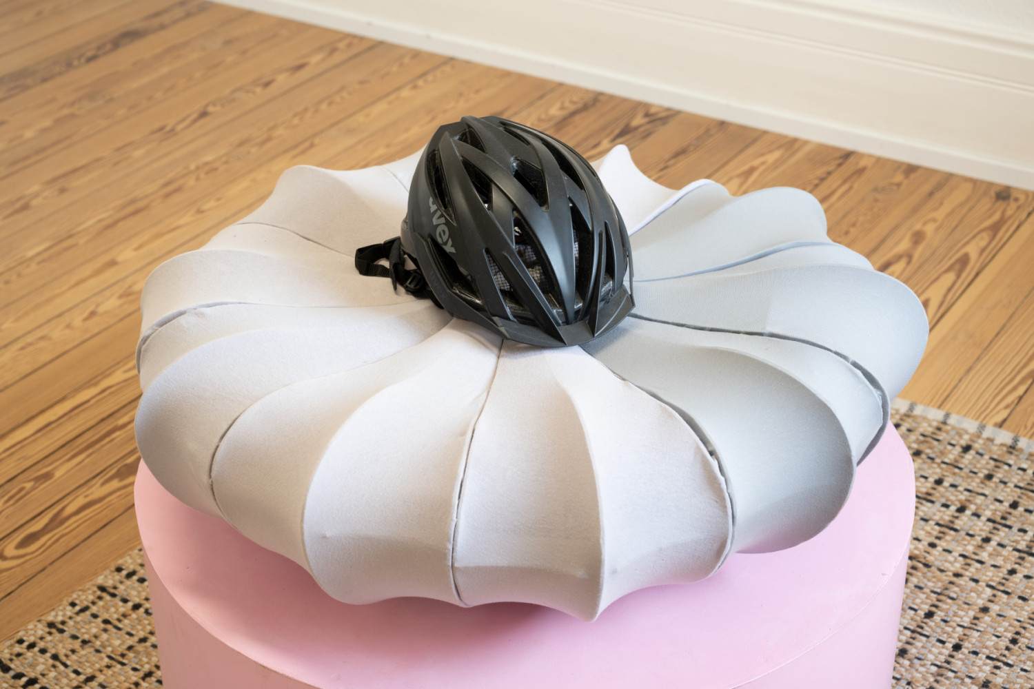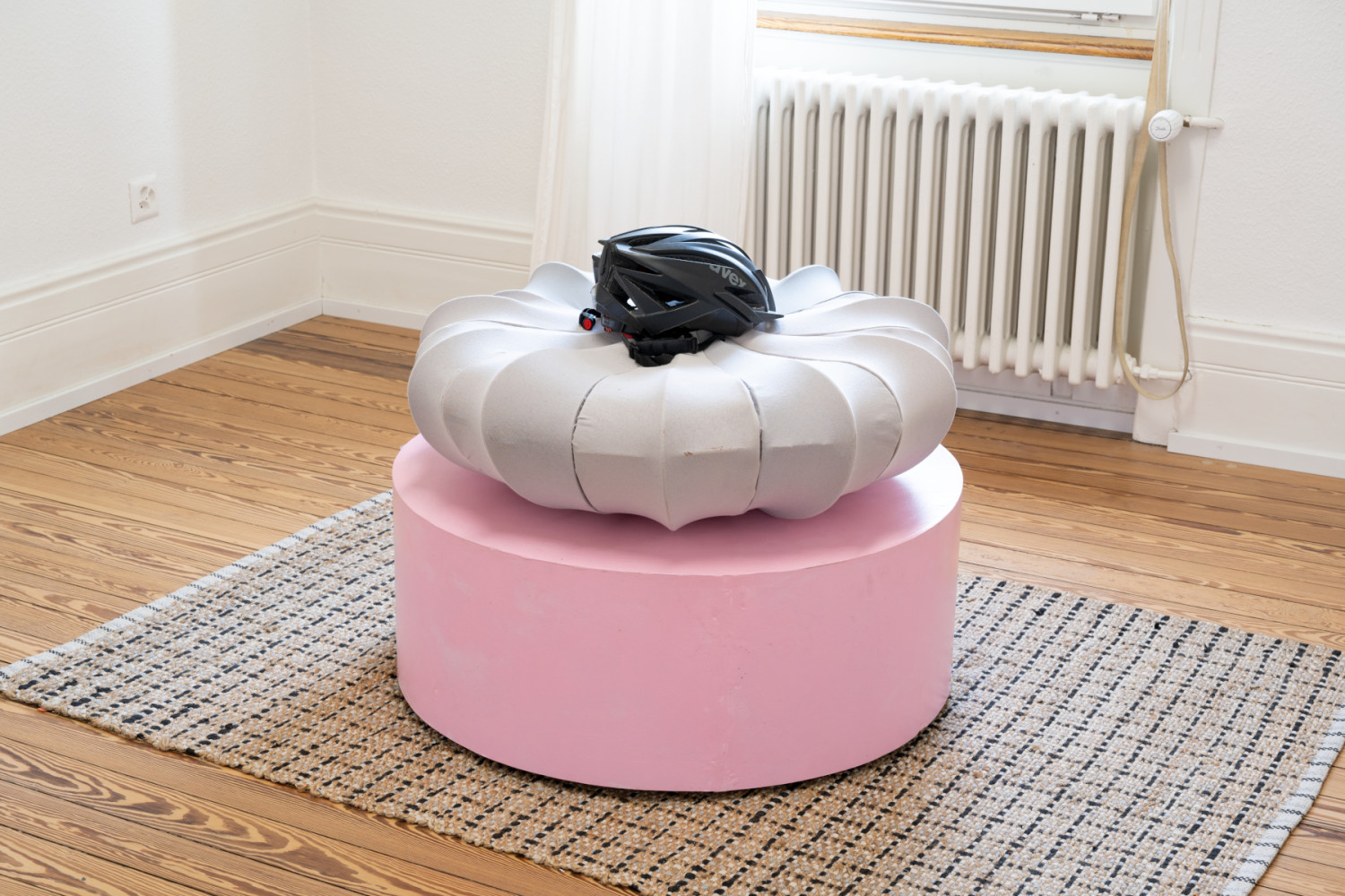 Andreas Kalbermatter. Pumpkin. Helmet, stretched fabric on cardboard and inkjet print on artist's pedestal. 2024.