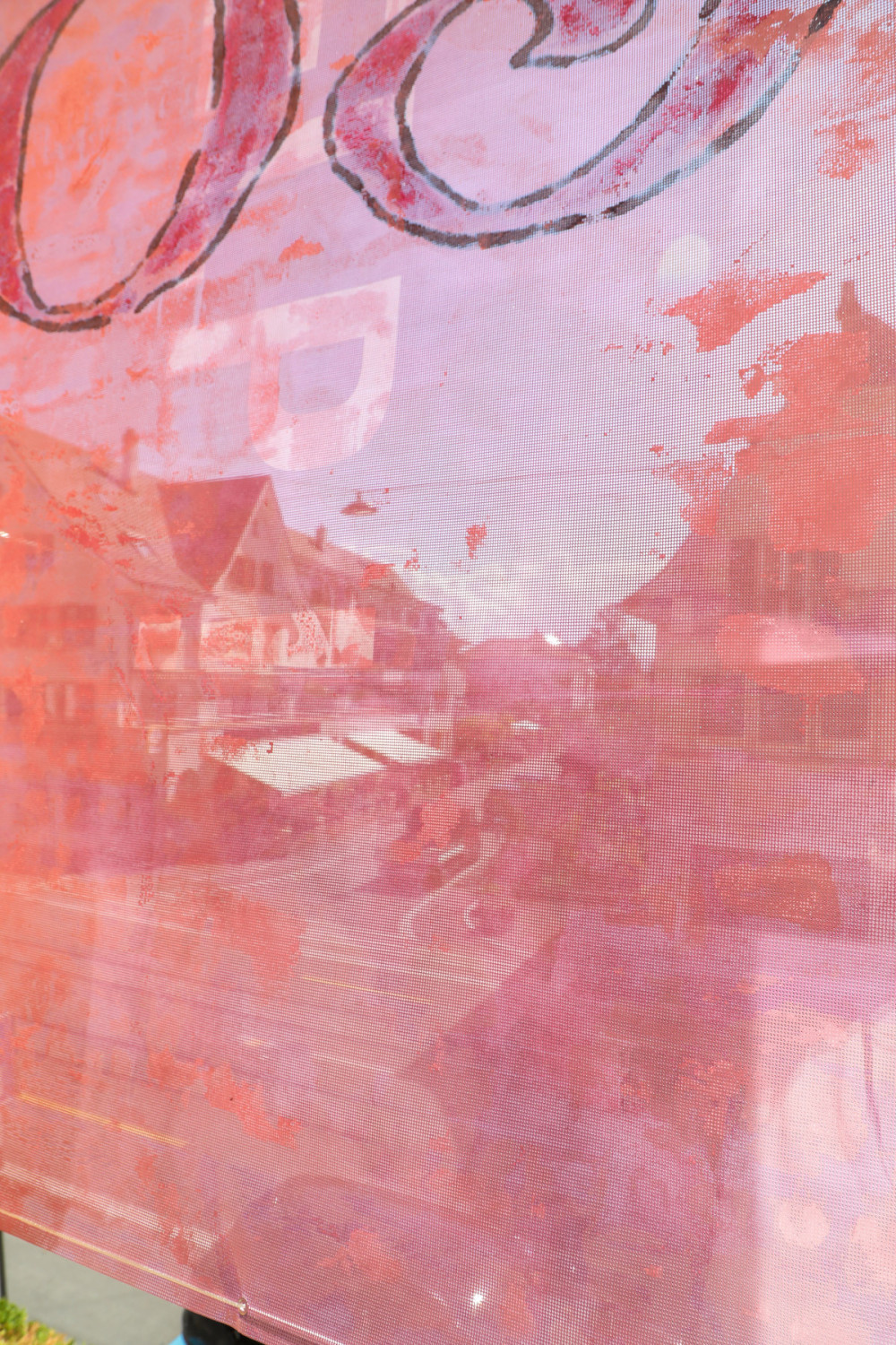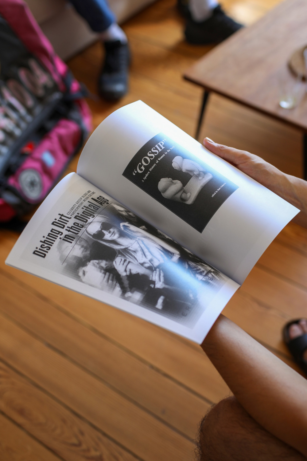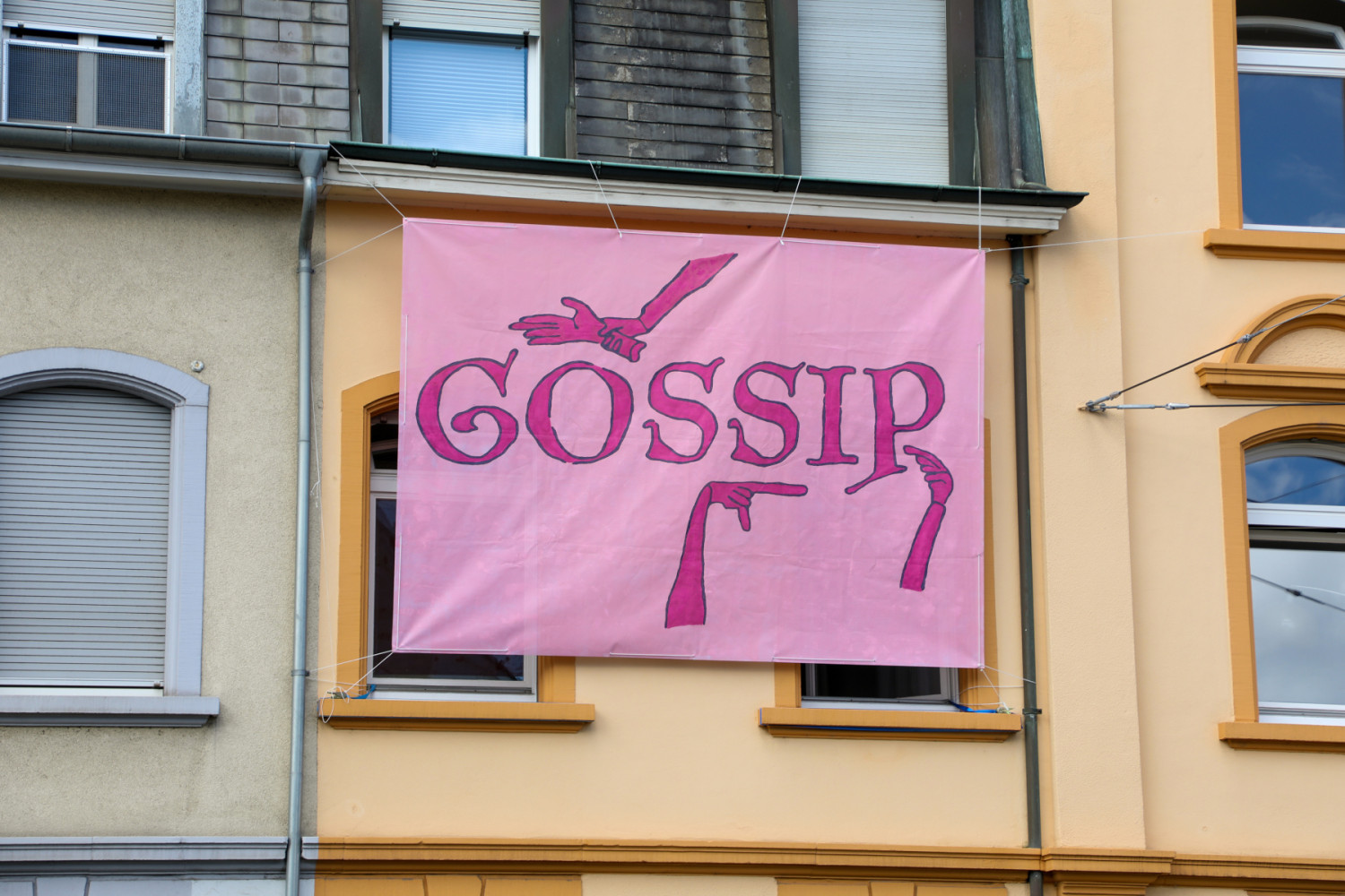 Next to a research compiling images of book covers with the word 'gossip' on them, this edition includes a short essay by Polly Wright (IG @pollewright) that contextualises the work of the banner and the place where it is currently shown.
