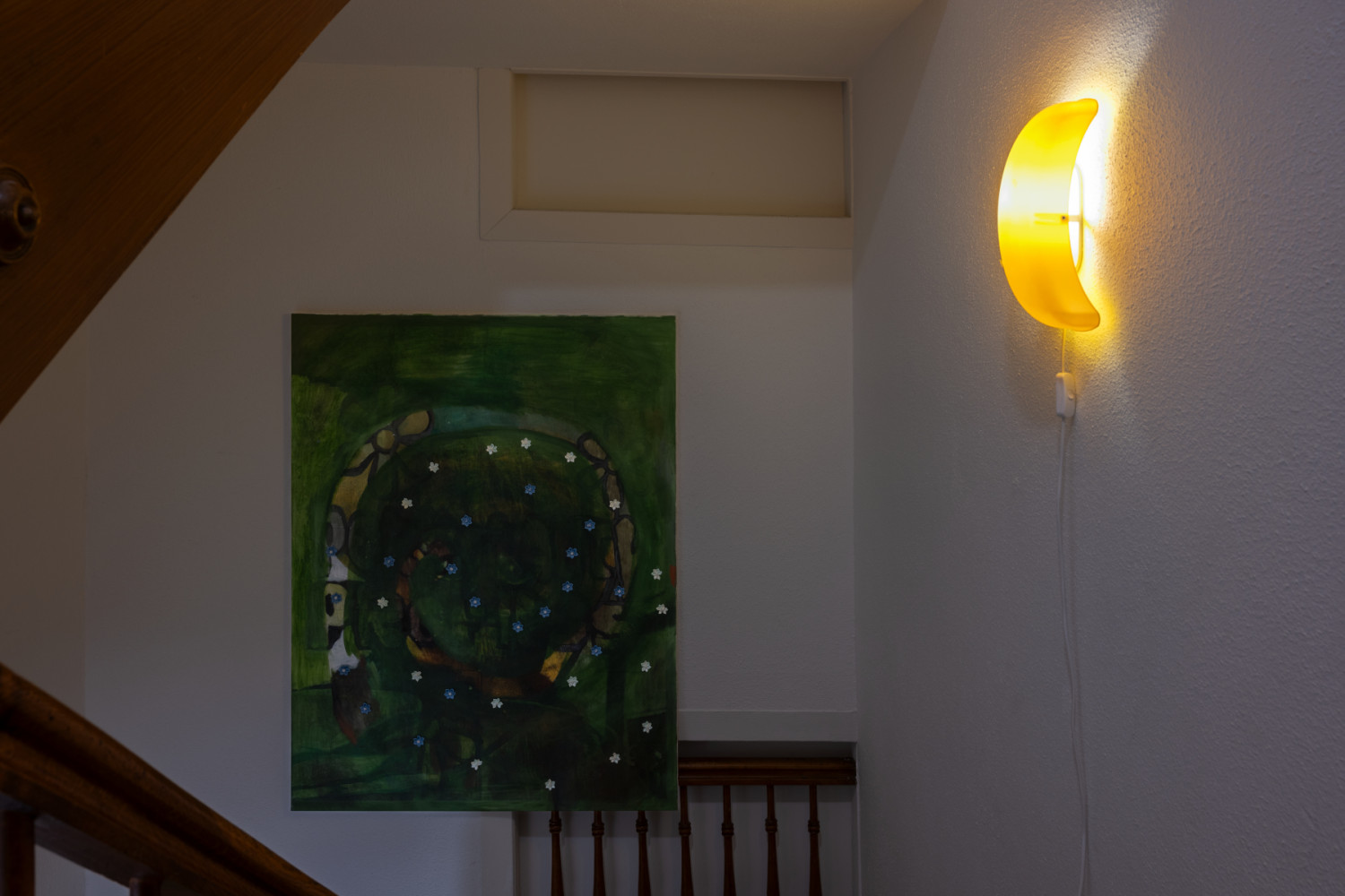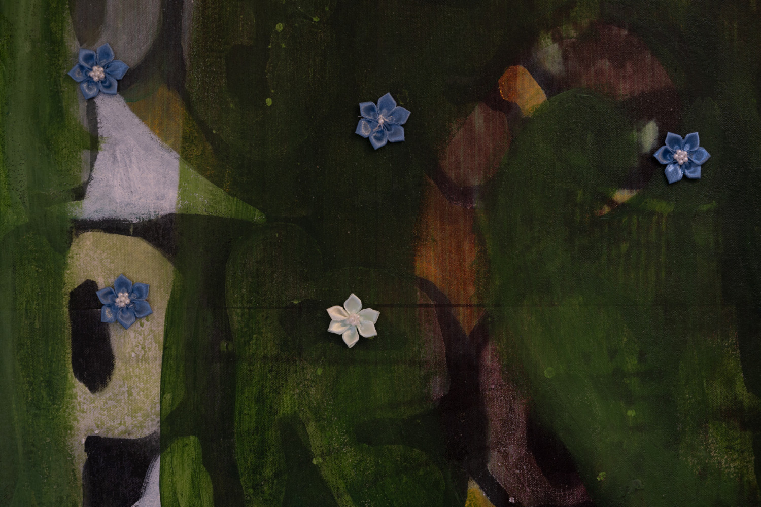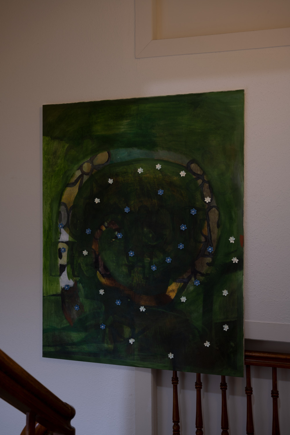 Ray Hegelbach. Untitled. Inkjet transfer print, oil, acrylic and decor flowers on canvas. 135 x 105 cm. 2020.