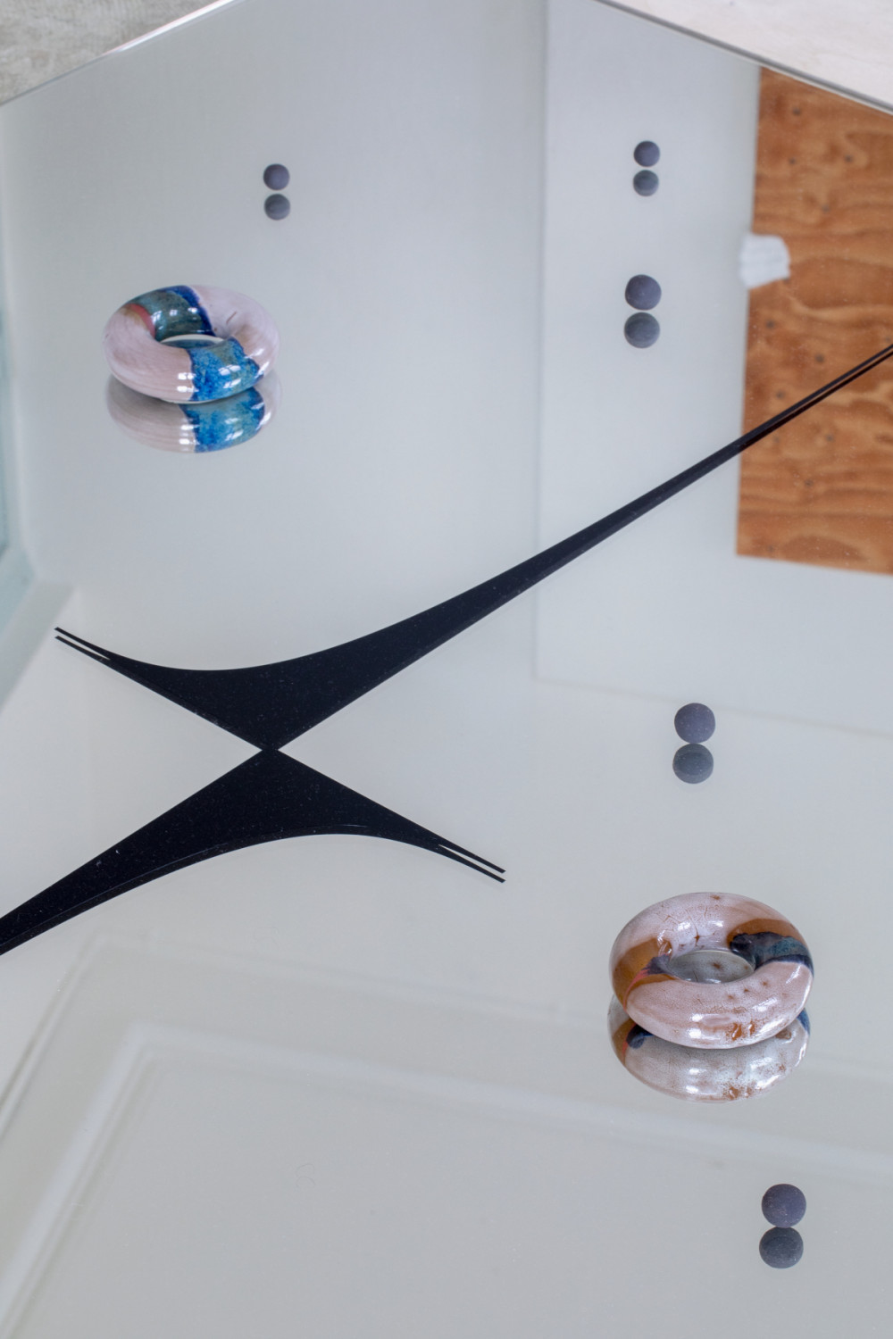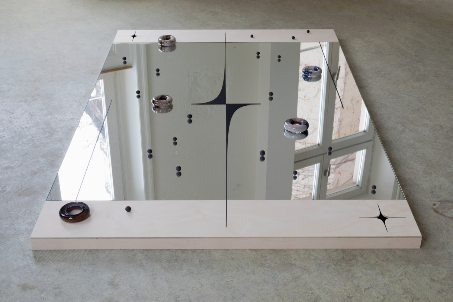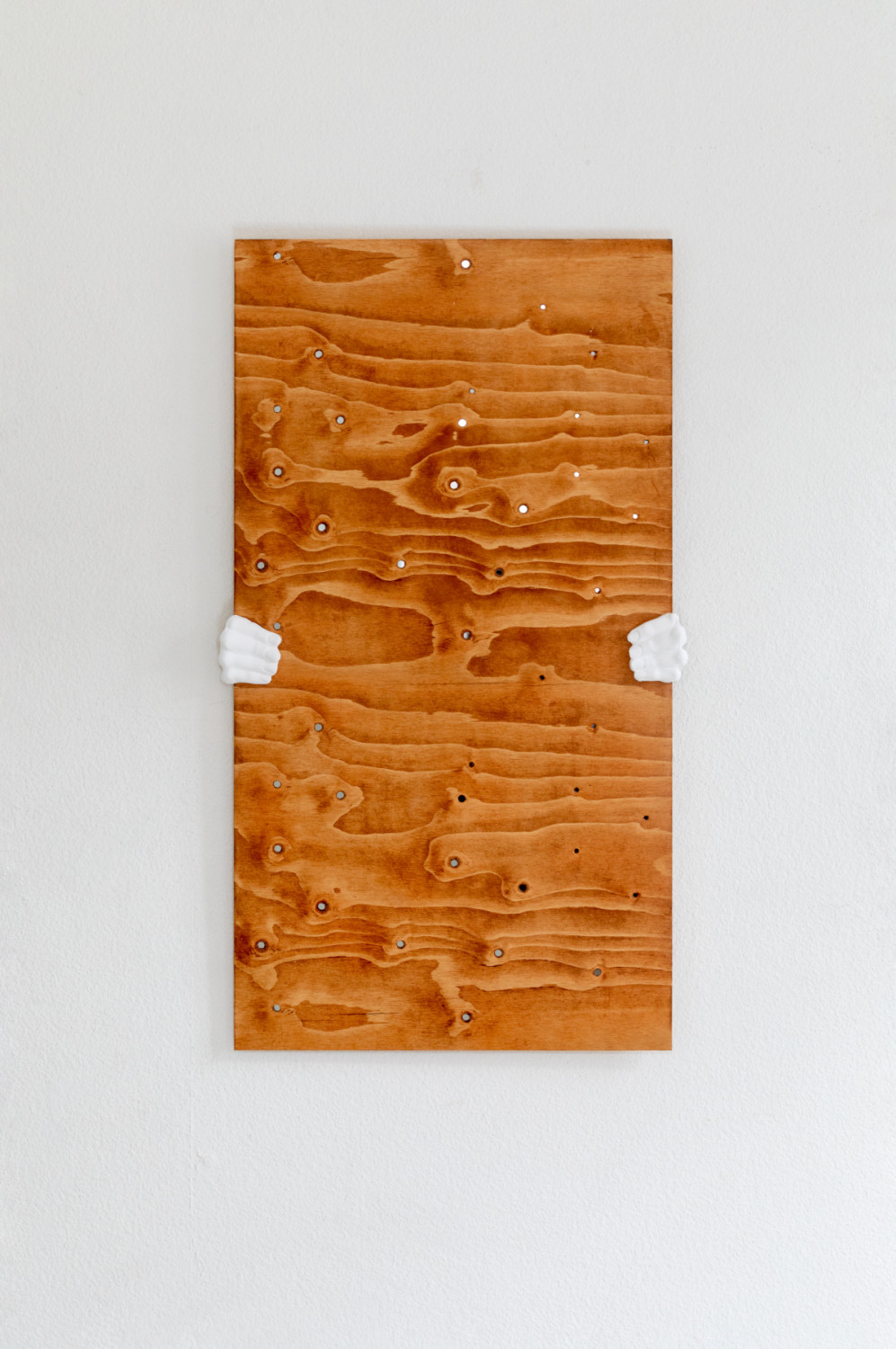 Djellza Azemi. In a sexy way where it’s not obvious. Plaster, paint, plywood, wood wax and mirrors. 91 x 49 cm. 2022.