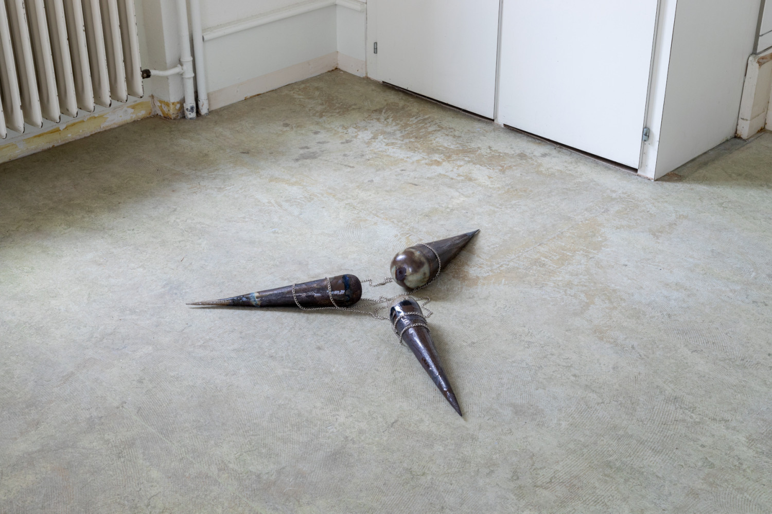 Remy Ugarte Vallejos. Guides, guards and grounds. Ceramics, wood, vinyl and chains. Variable dimensions. 2022.