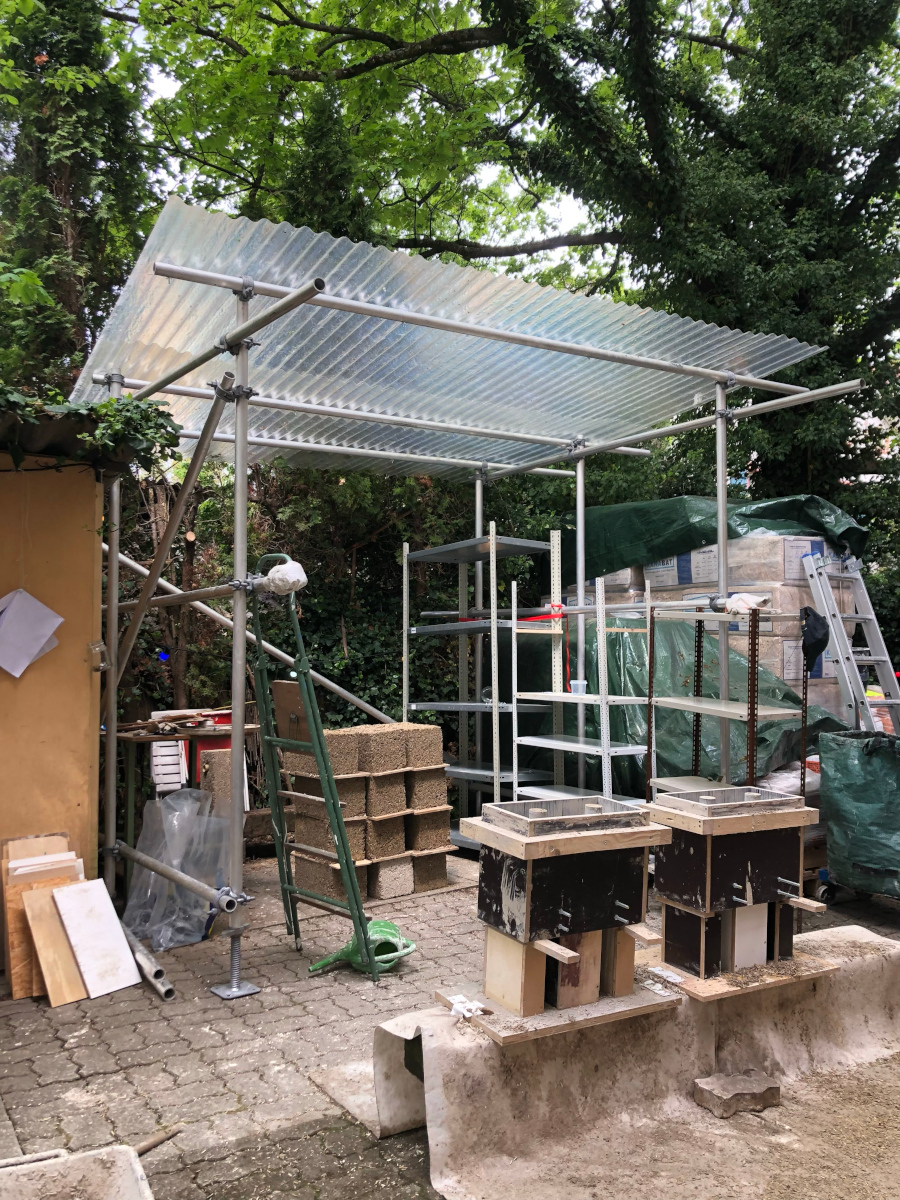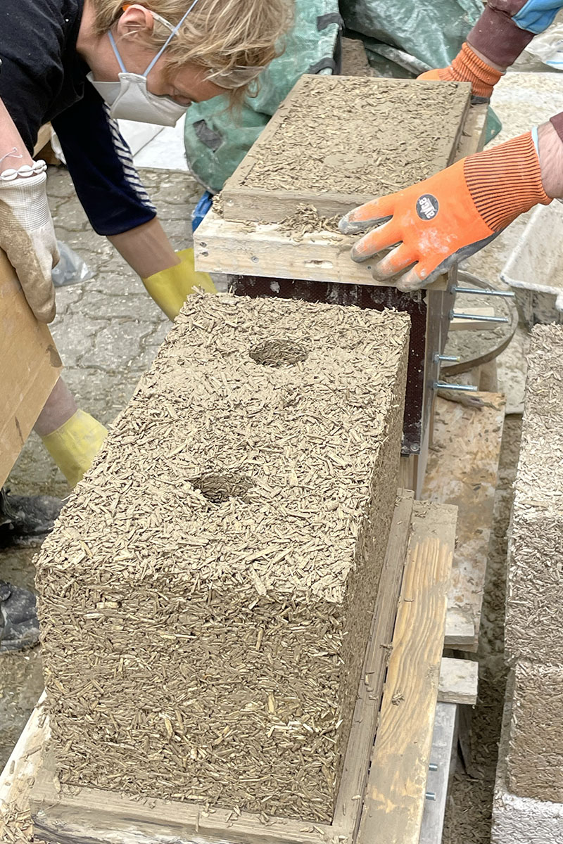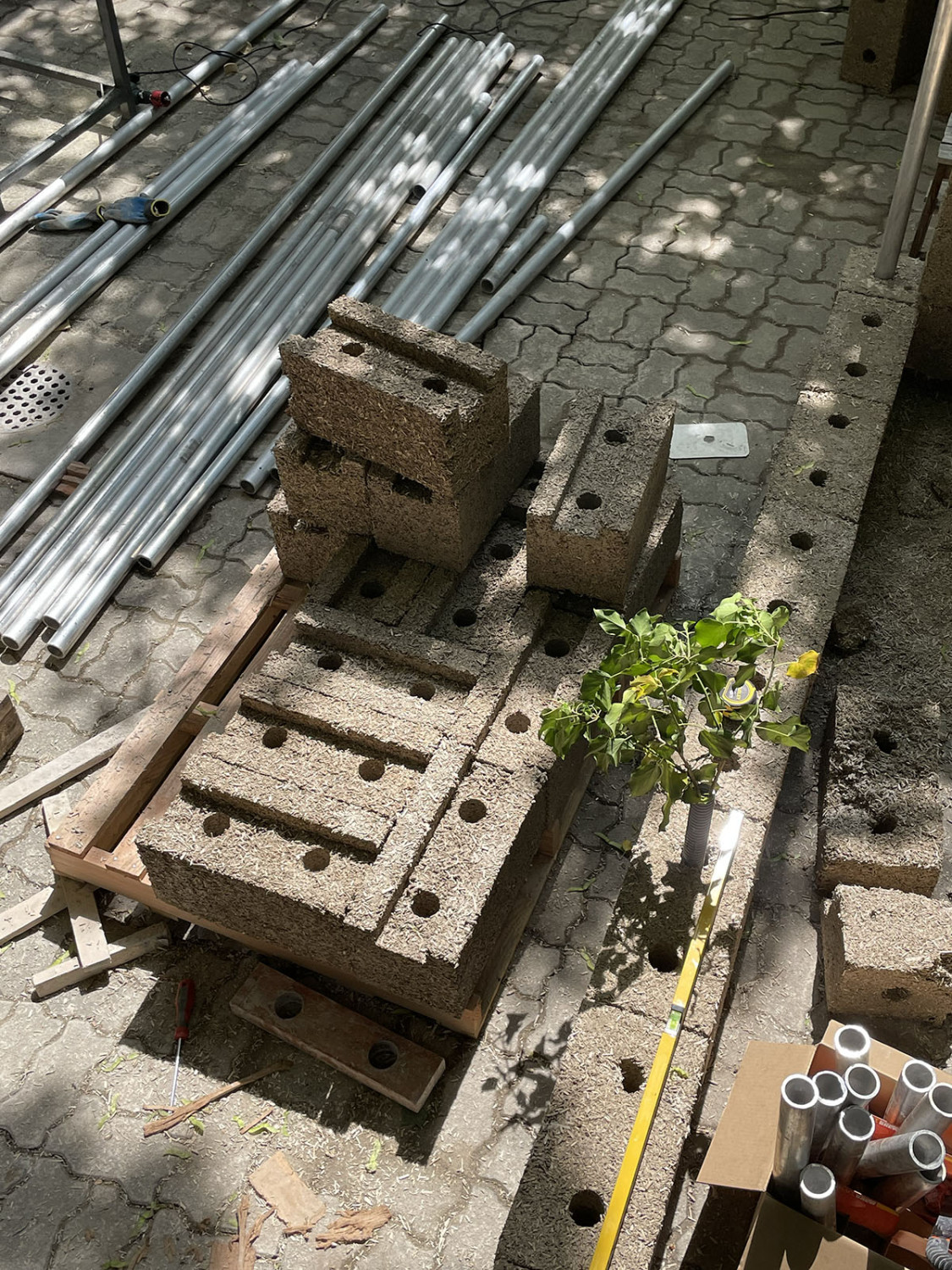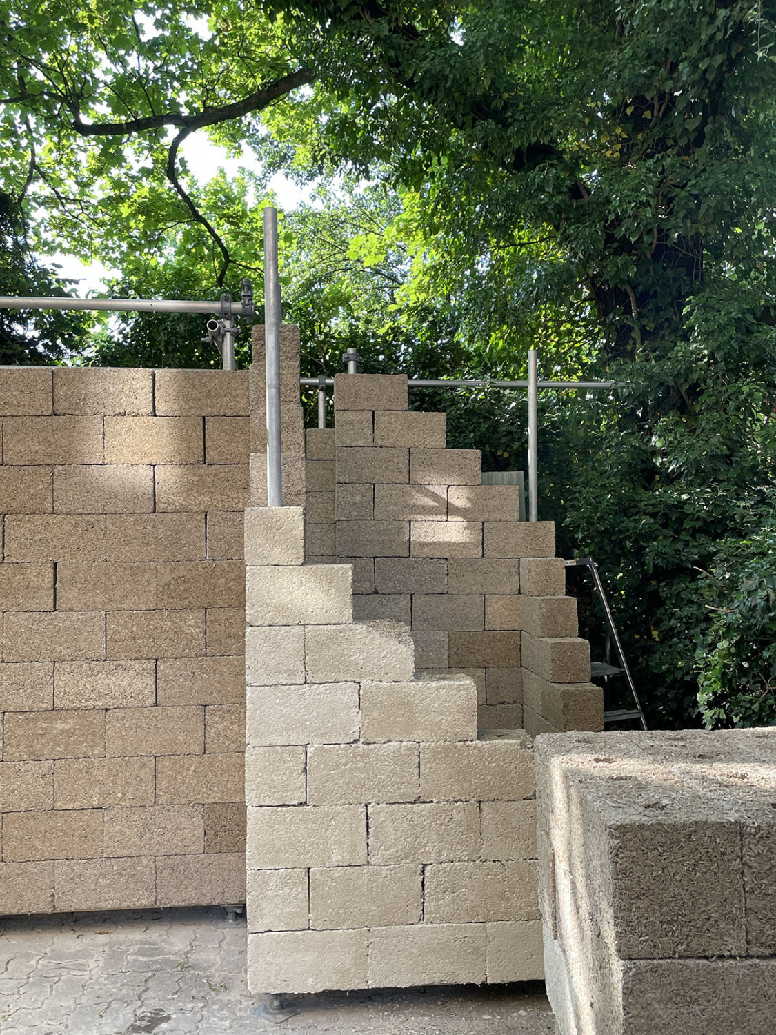 The goal of the project was to create a modular space that could take many shapes and possibly be fragmented in the future. To make this happen we constructed hemp-bricks that would allow for a scaffolding system to be embedded inside of them. This method not only ensures structural integrity but also provides flexibility in shaping the space to accommodate different exhibitions or artworks.